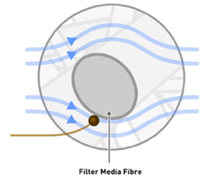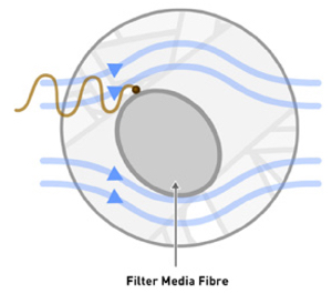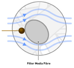 Din cauza caracterului aleatoriu al patului de fibre de sticlă, aerul comprimat trebuie să urmeze un traseu sinuos. Pe măsură ce fluxul de aer își schimbă rapid direcția pentru a evita șuvițele de fibre de mediu filtrant, aerosolii și particulele cu o masă suficientă nu reușesc să facă acest lucru din cauza inerției lor, acestea se ciocnesc și ele de mediu filtrant și sunt colectate și reținute.